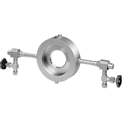 環(huán)形室孔板由兩個(gè)壓在一起的環(huán)組成,孔板夾在環(huán)之間。通過(guò)環(huán)形室在上游和下游測(cè)量壓力。即使入口和出口流量減少,其精度也可與標(biāo)準(zhǔn)孔板相媲美。測(cè)量部分由差壓傳感器和相關(guān)的入口和出口部分組成。它們用于即使很小的管道公差也會(huì)對(duì)測(cè)量結(jié)果產(chǎn)生重大影響的小型管道。作為標(biāo)準(zhǔn),環(huán)形室孔板用作壓差傳感器??蛇x地,其他傳感器也是可能的。用于安裝在法蘭或管接頭之間的槳式孔板由帶有焊接手柄的孔板組成。這些板沒有測(cè)壓口,因此通常安裝在包含½”NPT測(cè)壓口的法蘭之間。